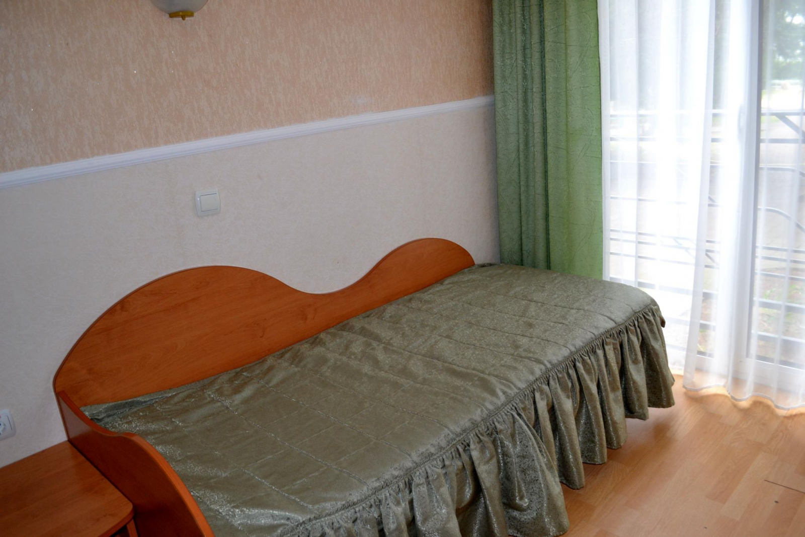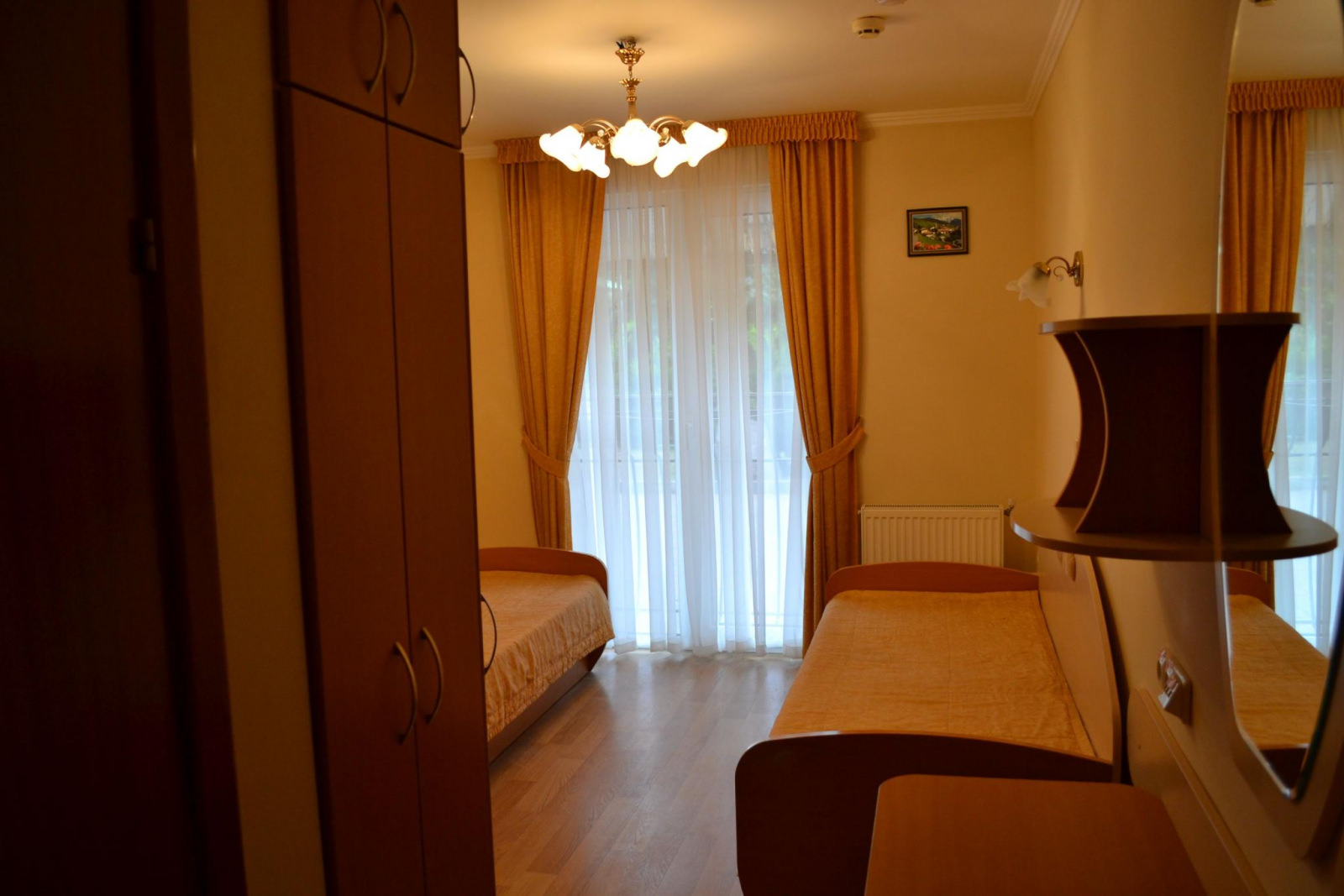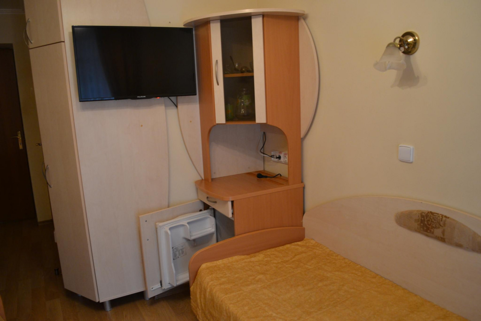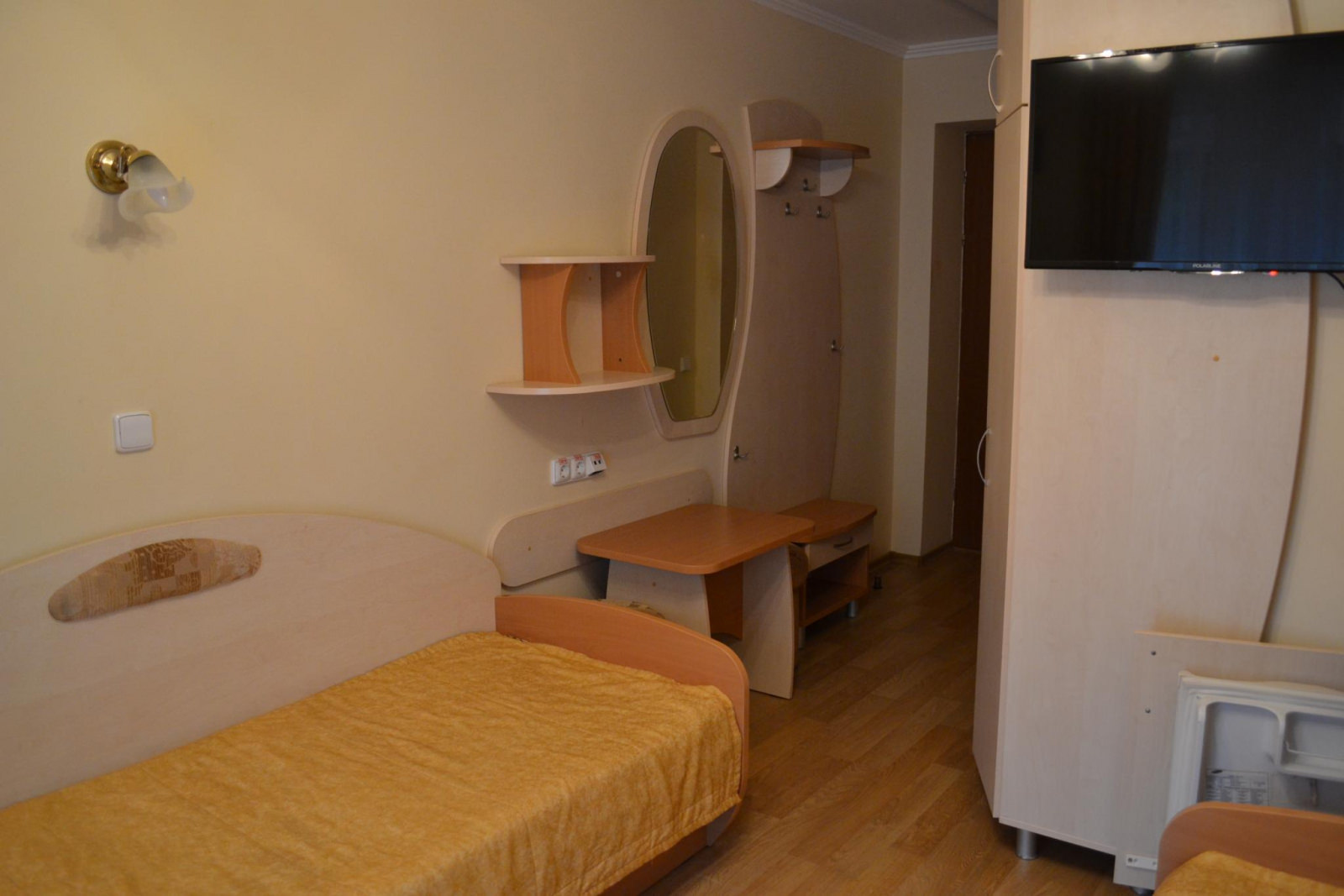 В номере две раздельные кровати, тумбочки, шкаф, пуфик, журнальный столик, зеркало. Оборудование: холодильник, телевизор.
